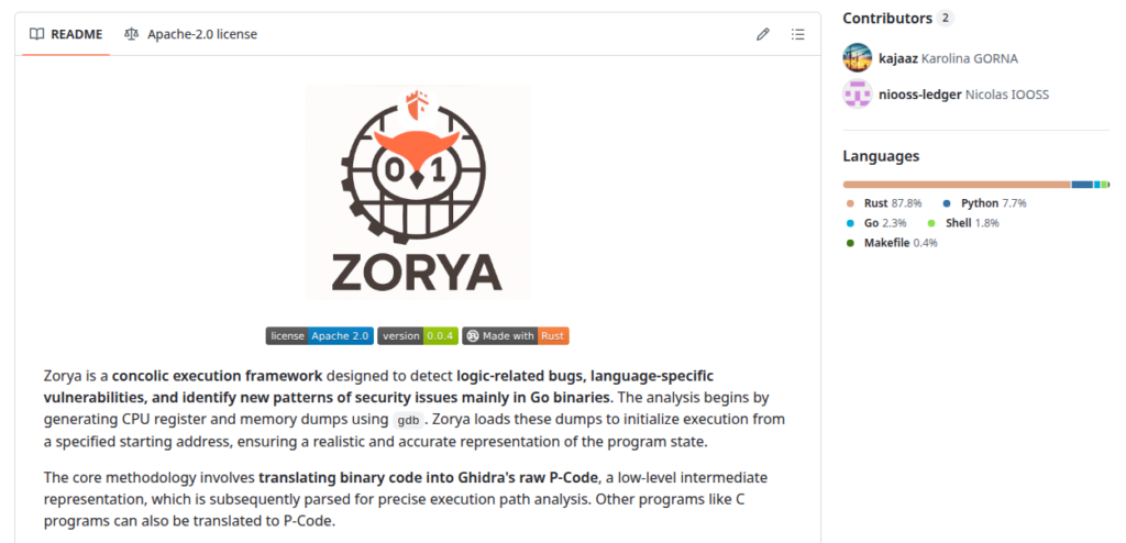 I’m the main developer of ZORYA, a concolic execution tool specialized for analyzing Go binaries. It’s designed to be user-friendly and automatic, helping developers build more secure Go code with minimal effort. Our architecture leverages Ghidra’s powerful intermediate representation (P-Code), which gives Zorya the capability to analyze binaries from many different languages, not just Go.