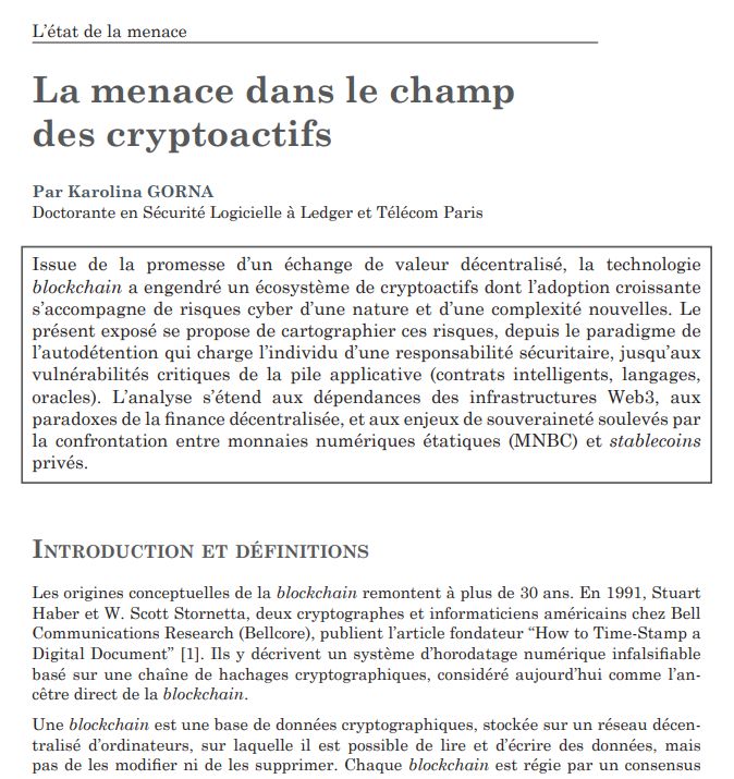 Ma contribution porte sur “La menace dans le champ des cryptoactifs”, avec pour objectif d’éduquer et expliquer avec des termes accessibles les différents aspects du blockchain et du Web3 à travers le prisme de la cybersécurité.
